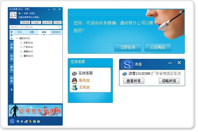 • 免費為搜了網的建站客戶提示在線客服的功能,只有訪客打開了商鋪的頁面,搜了通馬上提示,為訪客和店主提示熱情的服務